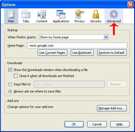 Kada otvorite mozilla firefox kliknite na Tools > Options Zatim kliknite na Advanced